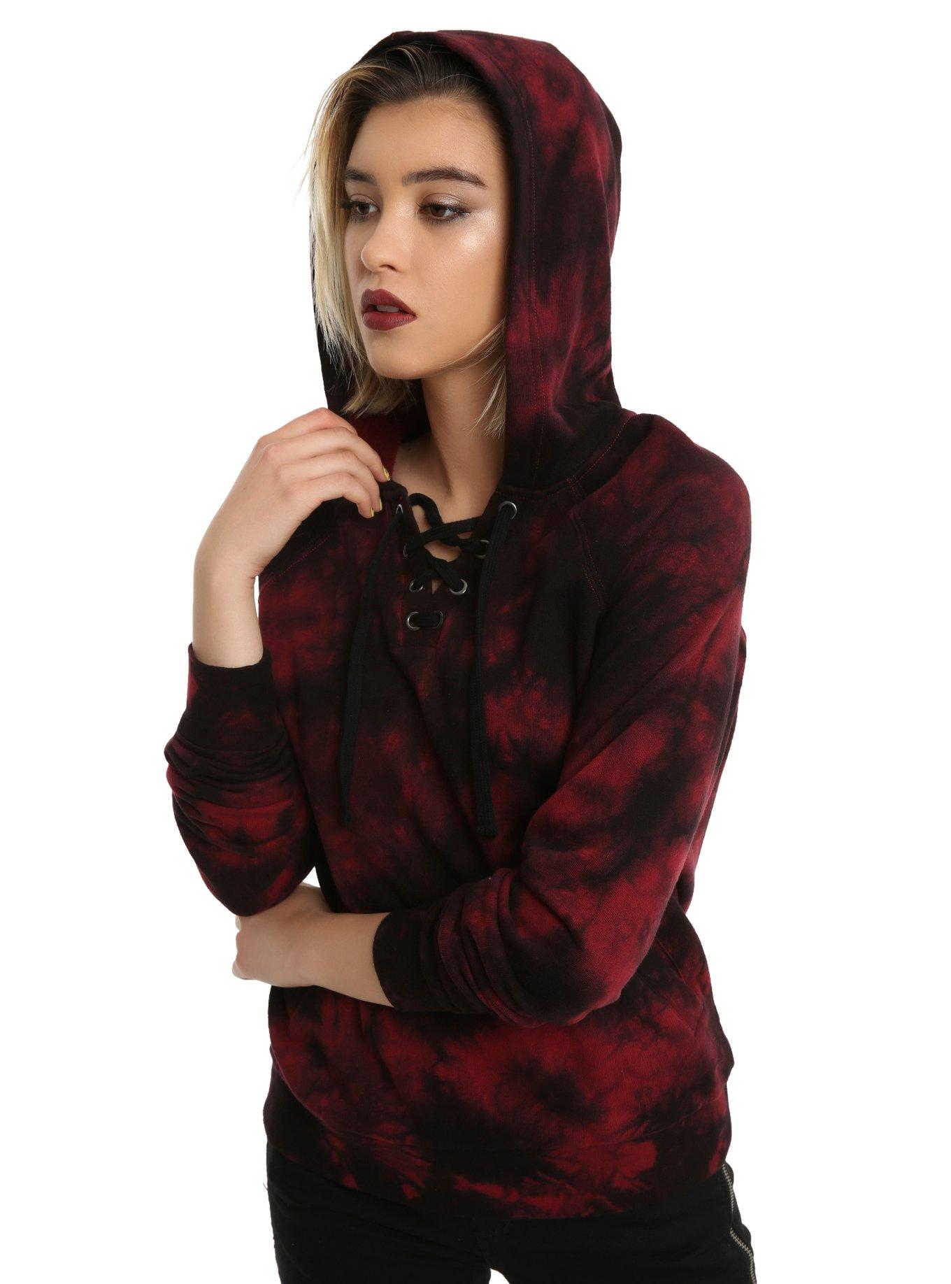 Shop Womens Hot Topic Pink Purple Size M Sweatshirts Hoodies at a discounted price at Poshmark. Tie dye hoodie with a lace up collar. Deep red and black tie dye with lace up draw string.